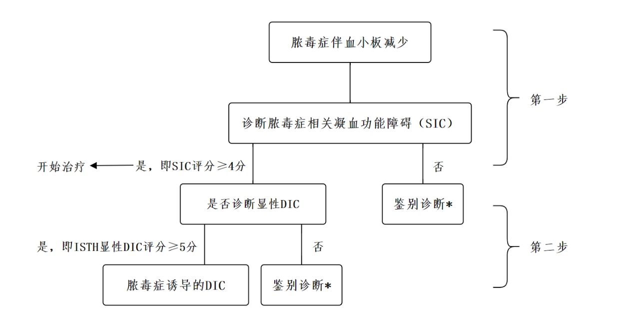 *鉴别诊断包括其他原因造成的凝血指标的异常(如肝病、抗凝药物、大量失血等)、血小板减少(如免疫性血小板减少、药物因素、血栓性血小板减少性紫癜及其他血栓性微血管病等)以及其他一些血栓栓塞性疾病或具有血栓形成倾向的疾病。 图 1 脓毒症相关凝血功能障碍诊断两步法[32]