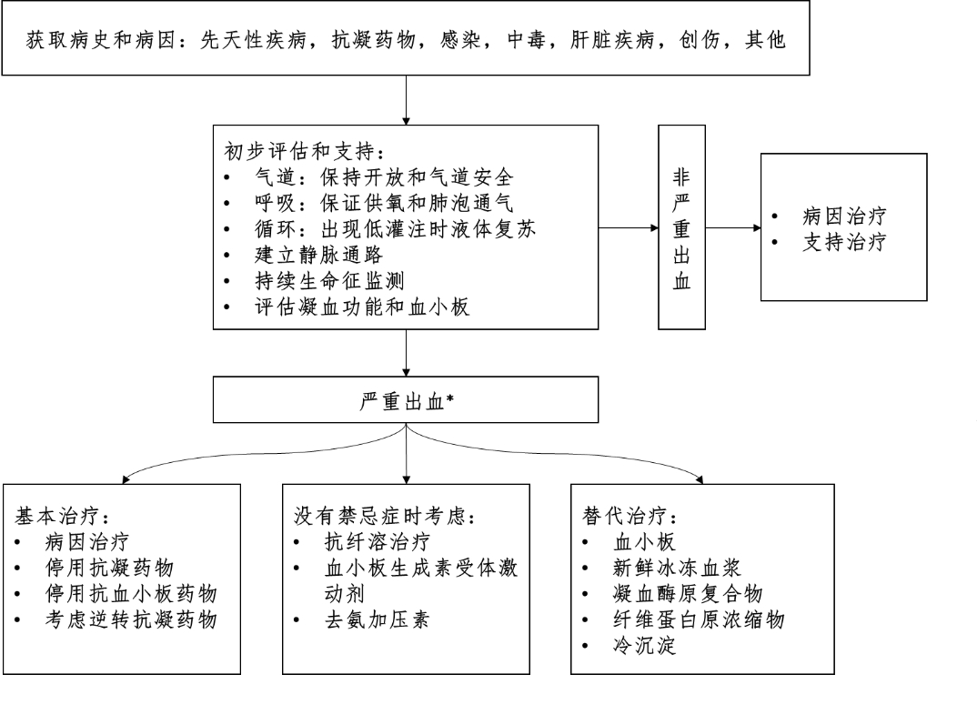 严重出血:指凝血功能障碍患者出现大量失血,或者重要的封闭体腔内出血(如颅内出血、眼眶内出血、后腹膜出血),或者需要手术、介入或内镜止血的活动性出血 图 2 急性出血性凝血功能障碍处理流程