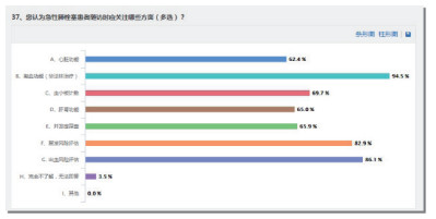 2.2.3 特殊患者的抗凝治疗无症状的亚肺段PTE患者治疗,83.2%认为需要进行抗凝治疗、6.6%认为不需要、10.1%不了解;存在活动性出血或出血倾向患者的抗凝治疗,54.6%认为不应给予抗凝,31.2%认为应给予抗凝,14.2%认为不了解;创伤骨折继发DVT患者的抗凝治疗,38.2%认为需要抗凝4~6周后可以进行手术、39.9%认为是2周后、22.0%不了解;冠状动脉支架术后伴发急性PTE是否继续使用原有的抗血小板药物,16.5%选择使用低分子肝素抗凝时应停用抗血小板药、71.1%认为不能停用、12.4%不了解;合并肝素诱导的血小板减少的患者,23.4%认为选择磺达肝癸钠、41.9%选用阿加曲班、34.7%不了解;高度怀疑PTE导致心搏骤停时,73.1%认为应予以溶栓治疗、13.9%认为不应溶栓、13.0%不了解;高危PTE合并下肢近端漂浮血栓下腔静脉滤器置入,88.7%认为需要、1.7%认为不需要、9.6%不了解;抗凝3个月后仍有残余血栓,72.8%认为应继续抗凝、15.3%认为可以终止抗凝、11.8%不了解;抗凝治疗期间合并需要手术治疗的疾病,41.6%认为可以接受手术并参与拟定术后的抗凝治疗方案、19.1%认为需要视病情择期手术、14.5%认为由手术部位决定、5.2%认为应急诊手术、19.7%不清楚;抗凝期间复发相关的危险因素,30.3%认为PTE复发源于易栓症患者、29.8%为治疗不正规、23.4%为自身免疫病及各类代谢指标、7.2%为活动期肿瘤。