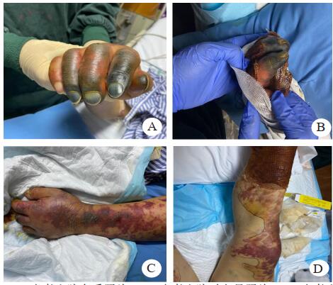 A:患者入院右手照片;B:患者入院时左足照片,C:患者入院时上肢照片;D:患者入院3 d后下肢照片(换药后) 图 1 患者入院时及治疗3 d后患肢照片