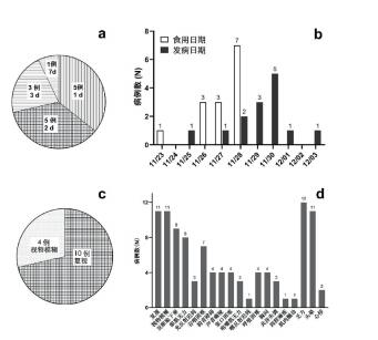 | 图 1 14例群体性食源性肉毒中毒患者的潜伏期与临床表现:a 14例群体性食源性肉毒中毒患者的潜伏期;b14例中毒患 者染毒豆腐乳食用日期与发病日期;c 14例中毒患者的首 发症状;d14例中毒患者的临床表现 Fig 1 The incubation period and clinical manifestations of the 14 patients with the outbreak of foodborne botulism:a The incubation period of 14 patients with the outbreak of foo dborne botulism; b The timing of consumption of contaminated bean curd and the onset date of botulism of the 14 patients; c The initial symptoms of 14 patients with the outbreak of foodborne botulism; d The clinical manifestations of 14 patients with the outbreak of foodborne botulism |