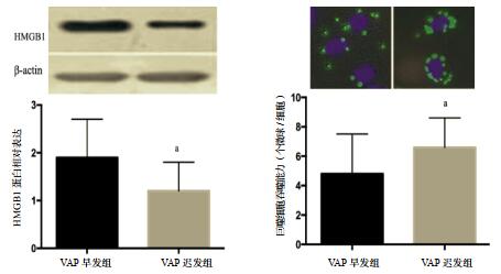 左图为两组肺泡巨噬细胞HMGB1相对蛋白含量的Western Blot结果;右图为巨噬细胞吞噬能力,绿色小点代表巨噬细胞吞噬的FITC标记乳胶微球(×400);与VAP早发组比较,aP < 0.05 图 1 肺泡巨噬细胞HMGB1的蛋白含量及吞噬能力