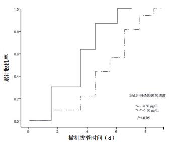 单因素分析影响患者7 d机械通气撤机插管拔率的危险因素包括TNF-α、IL-8、HMGB1及肺泡巨噬细胞内HMGB1的蛋白相对含量和吞噬能力。多因素Logistic回归分析显示BALF中的HMGB1浓度、肺泡巨噬细胞内HMGB1的蛋白相对含量及巨噬细胞吞噬能力均是患者能否7 d内机械通气撤机拔管的独立危险因素,见表 3
