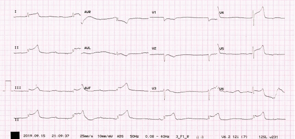 图 1 外院心电图(2019-09-15 21:09)示交界性逸搏,肢体导联低电压,多导联ST-T改变