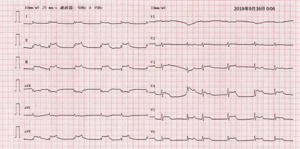 图 2 入院心电图(2019-09-16 0:06)示心房颤动,肢体导联及胸导联低电压,未见明显ST-T动态演变