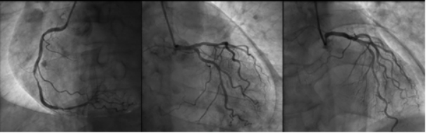 图 3 冠脉造影提示冠脉轻至重度狭窄,心影周围可见弧形透亮带