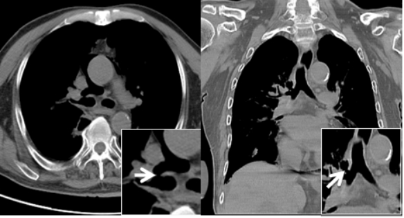 图 5 胸部CT(纵隔窗)白色箭头所指处为右主支气管与上叶支气管壁交界处见小缺损,考虑为右支气管破裂