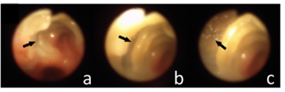 图 6 患者纤维支气管镜(A.左上方黑色箭头所指处为支气管破口,右上方为右肺上叶支气管入口,下方为右肺下叶支气管入口;B.破口近距离图,黑色箭头所指处为破口,周围覆盖白色组织;C.左侧黑色箭头所指处为支气管外瘘道黏膜,右侧为支气管)