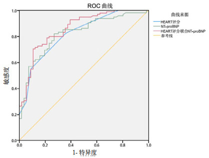 | 图 1 NT-proBNP水平、HEART评分及两者联合预测NSTE-ACS患者3个月MACE的ROC曲线 Fig 1 ROC curves of NT-proBNP level, HEART score and their combination predicting 3-month MACE in patients with NSTE-ACS |