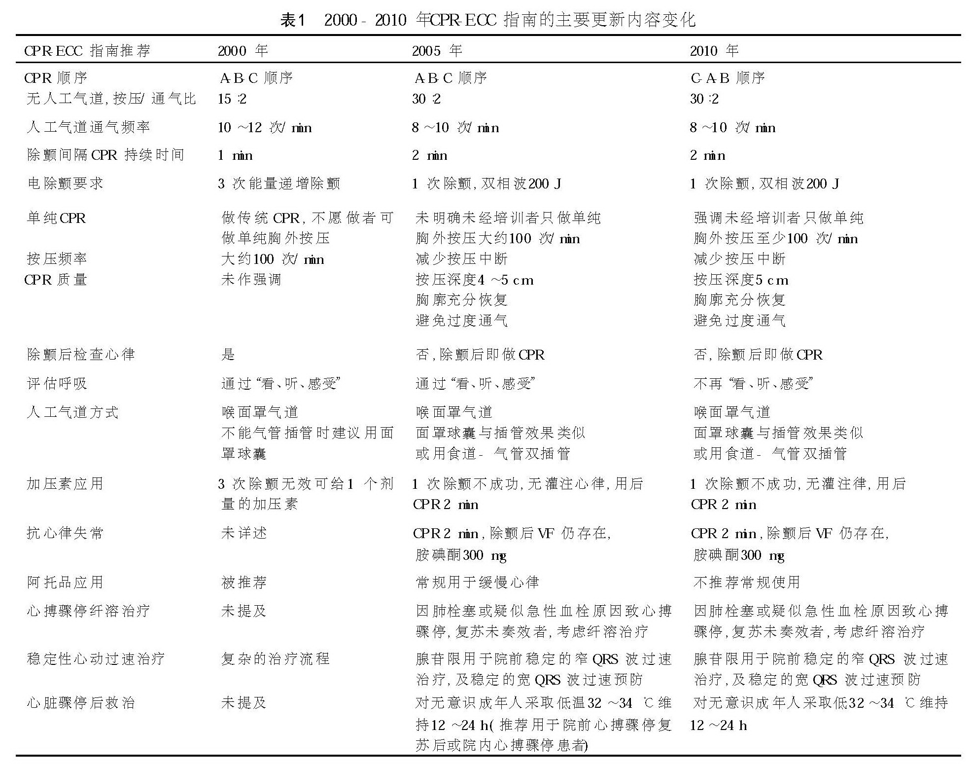 自2000年第一部国际CPR-ECC指南形成发布后,科学循证的评价使指南成为临床推荐方案的支撑点;随着医学证据的不断充实,指南更新也成为相关学科领域的关注点。2005年CPR-ECC指南对重要技术指标作了重大更改,2010年指南再度更新了相关内容。下表归纳了2000-2010年指南的主要变化。